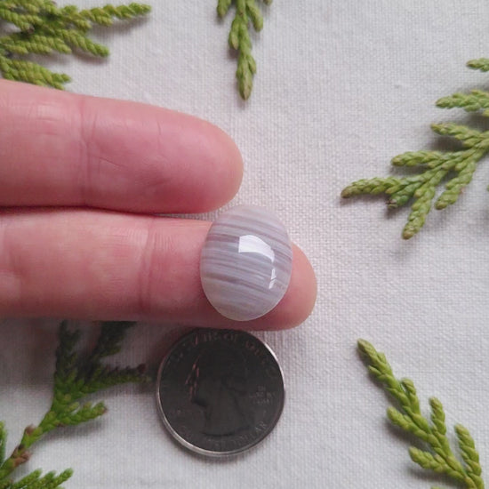 This waterline agate cabochon comes from deep in the hills of the Fraser Lake area of BC, Canada. It has a grey colour with slight blue tones and white waterline banding. 20x15x4mm 10.6ct
